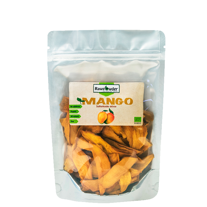 Rawpowders ekologiska, soltorkade mango av sorten "Amelie". Perfekt bl.a. som snacks och nyttigt godis.
