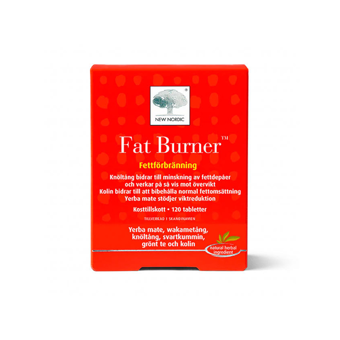 Fat Burner™ från New Nordic är ett örtbaserat kosttillskott i tablettform med 120 tabletter per förpackning. Produkten kombinerar yerba mate med wakame, knöltång, svartkummin, grönt te och kolin.