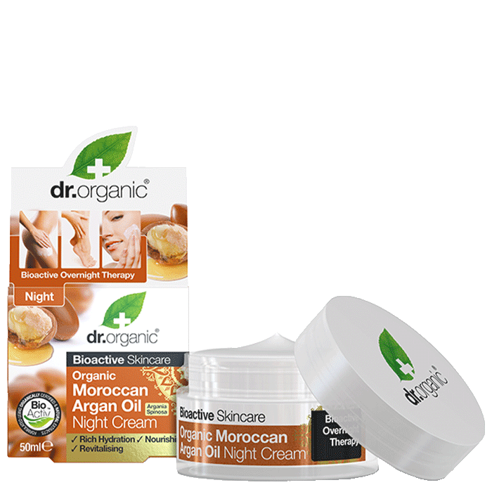 Dr Organic Nattcreme Arganolja inehåller extrakt från afrikanska Kigelia, Roselle och Baobab som med sitt antioxidantrika innehåll reparerar huden och motverkar rynkor.