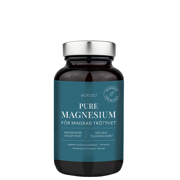 Pure Magnesium är ett kosttillskott från Nordbo som innehåller magnesiumbisglycinat. Med tydligt deklarerad mängd elementärt magnesium, 300 mg per två kapslar. Vegansk produkt.