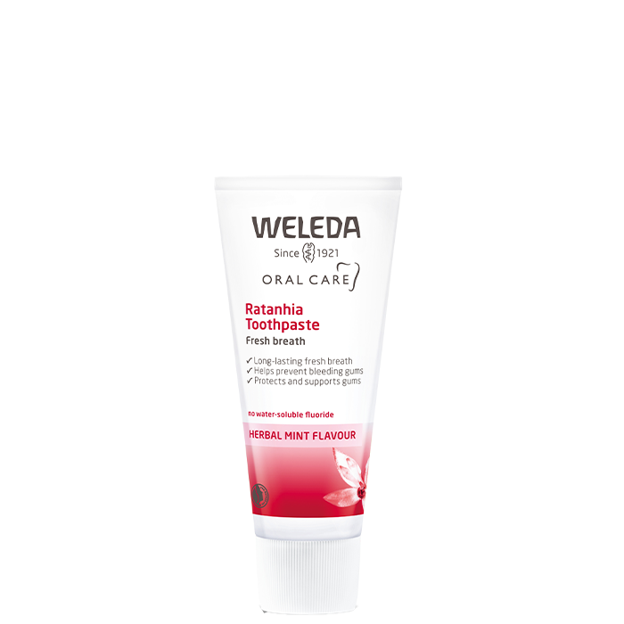 Den uppfriskande Ratania tandkrämen med en mineralisk putsdel av calciumcarbonat (krita) rengör tänderna skonsamt men grundligt.