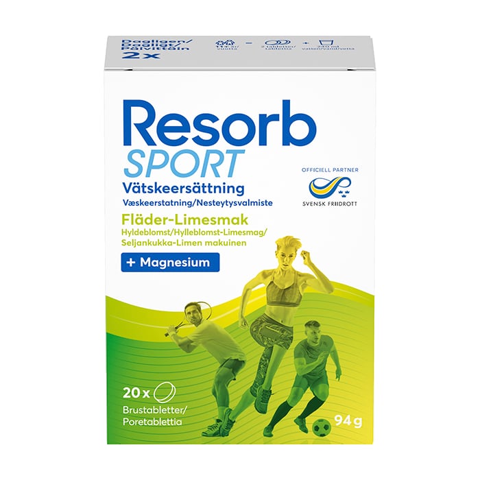 Resorb Sport med fläder-limesmak är ett kosttillskott i form av brustabletter med kolhydrat-elektrolytlösning och magnesium. Förpackningen innehåller 20 brustabletter.